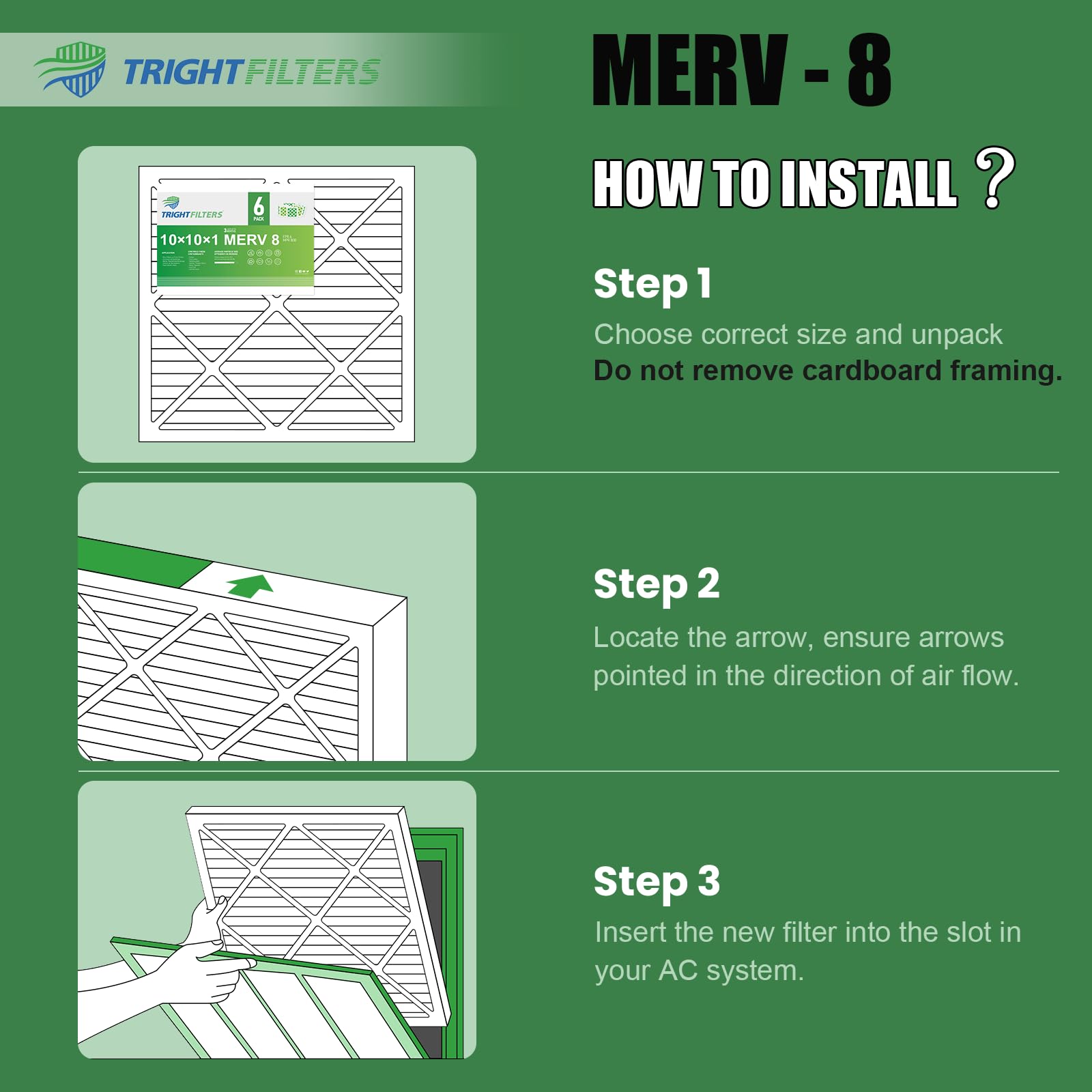 TRIGHTFILTERS MERV 8 10x10x1 filters have better air permeability relative to other MERV ratings, providing better airflow and efficiency and protecting your machine from damage, and extending the life of your machine.